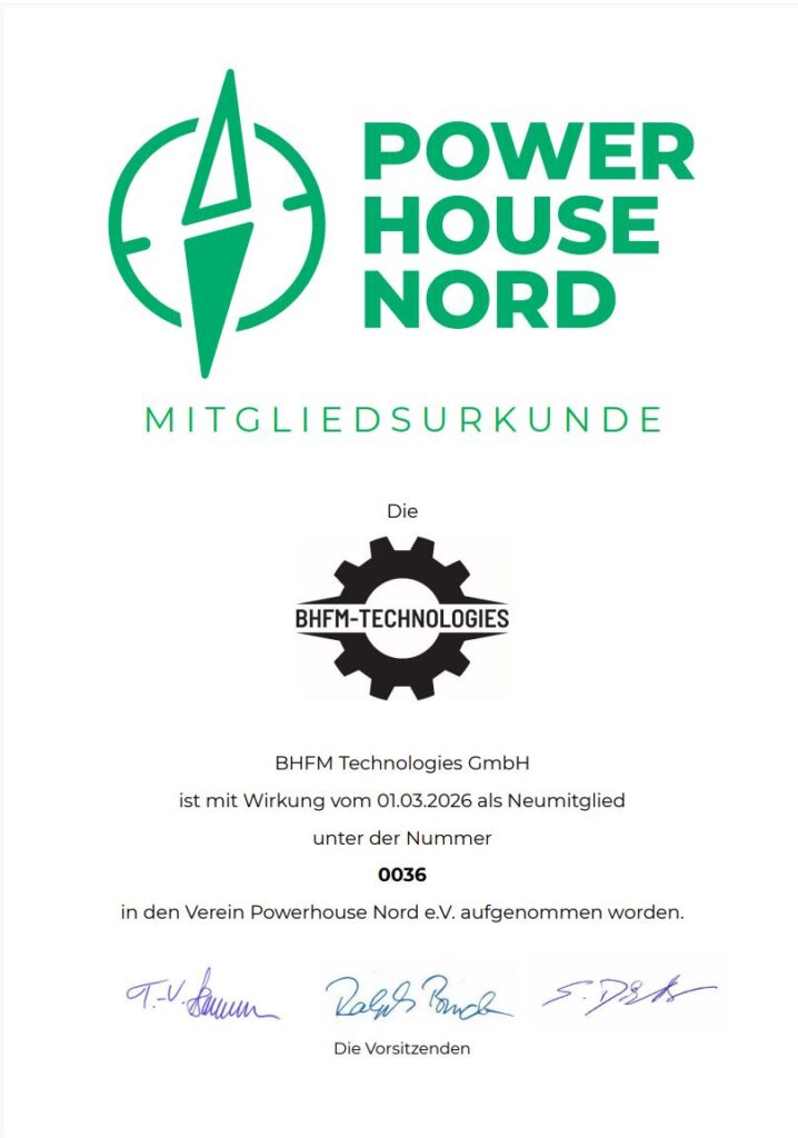 Die BHFM Technologies GmbH ist neues Mitglied im Netzwerk Powerhouse Nord. Mit dem Beitritt stärkt das Unternehmen seine Vernetzung innerhalb eines der wichtigsten Innovations- und Energiewendenetzwerke in Norddeutschland und unterstreicht gleichzeitig sein Engagement für nachhaltige Energie- und Mobilitätslösungen.